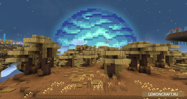 Мод на кольцо Эдема Eden Ring посвящен научной фантастике и основан на новом измерении, которое представляет из себя большое кольцо звезд кружащее вокруг газового гиганта - голубой планеты. В этом мире вы сможете исследовать 5 новых биомов, добыть 3 вида новой древесины, а огромное количество парящих островов с шикарным видом на голубое солнце не оставят вас равнодушным.